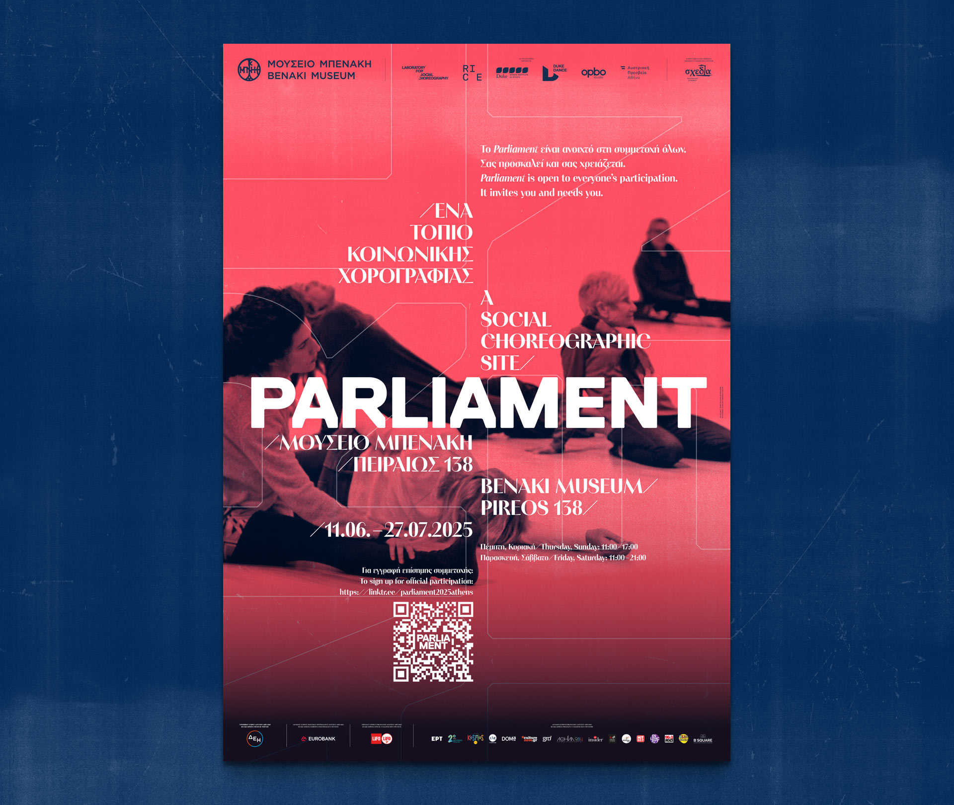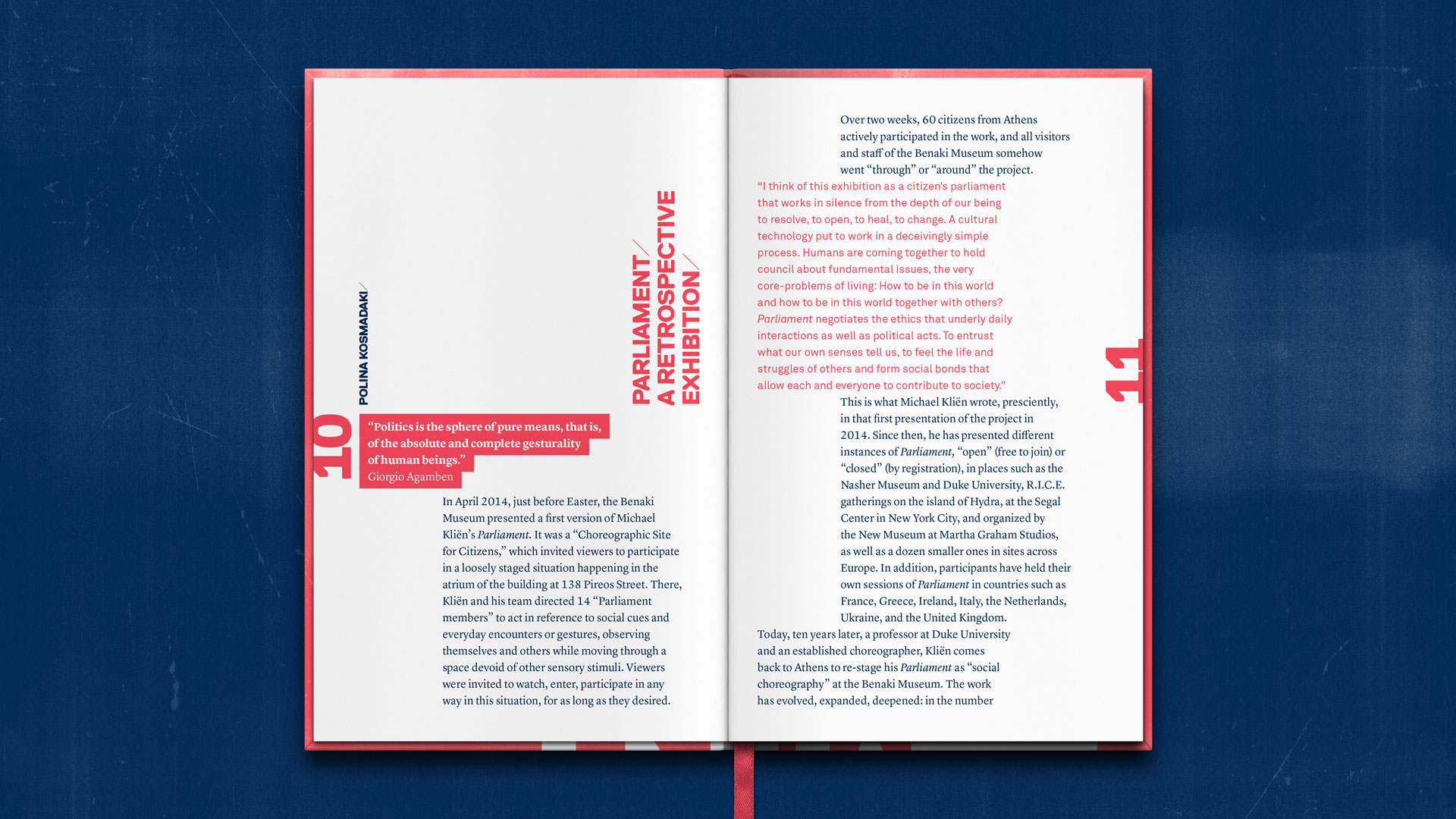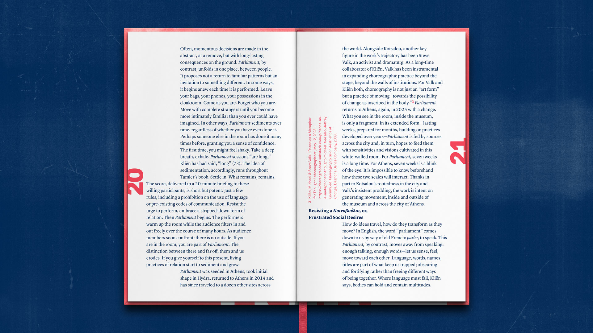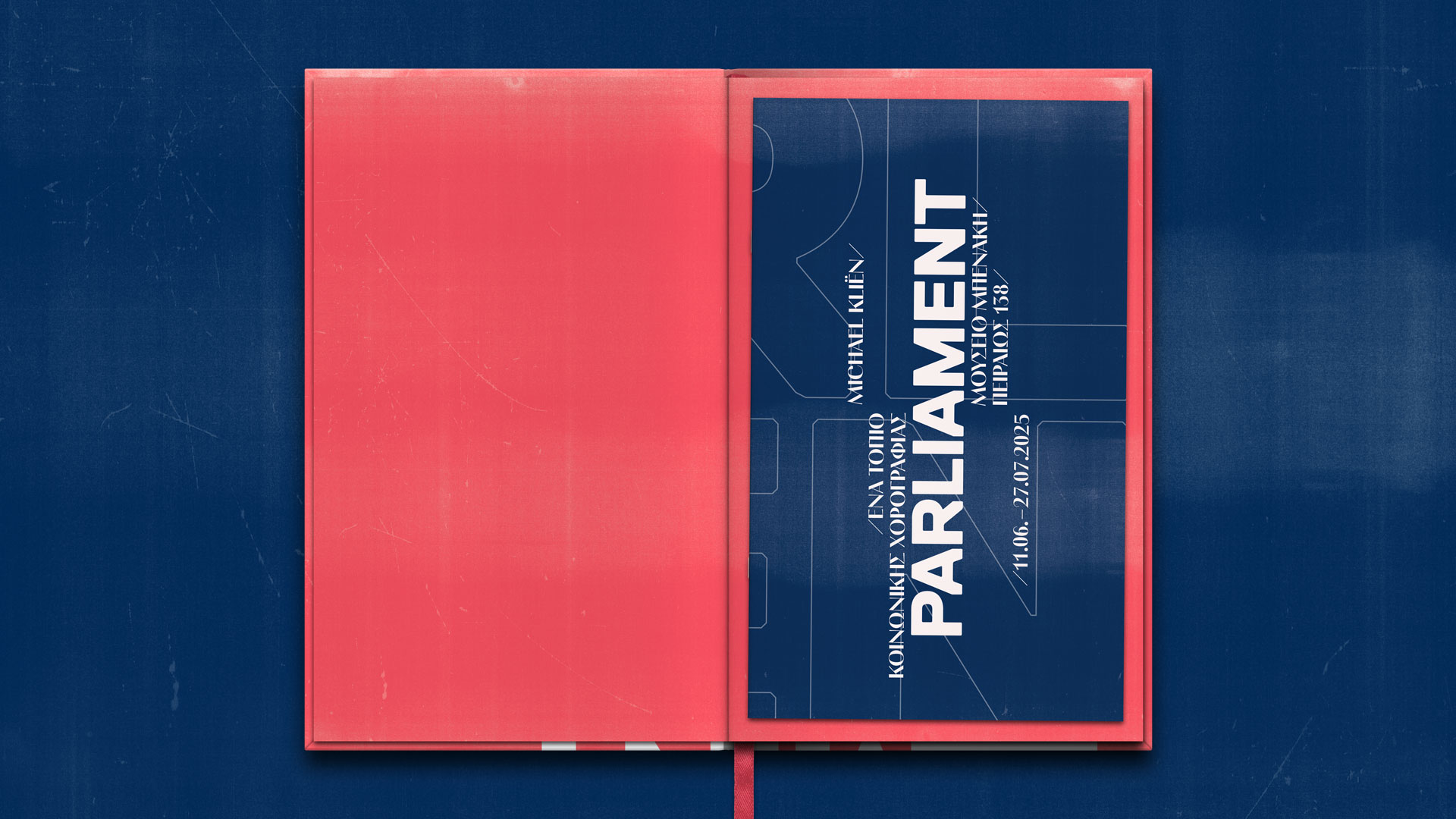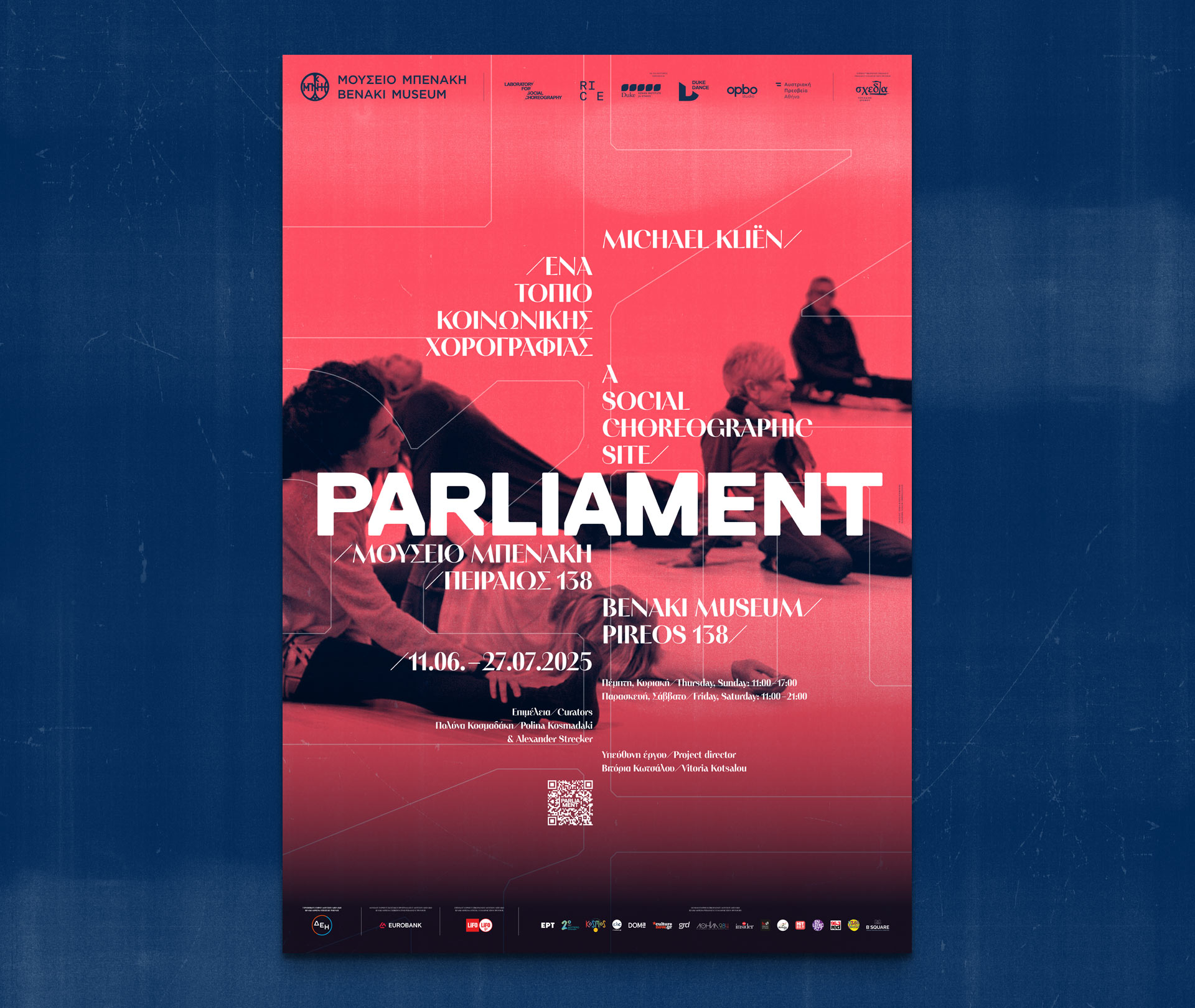 Parliament, a work by choreographer and artist Michael Kliën, is a landmark in the emerging field of Social Choreography. Conceptualized in 2011, Parliament was first exhibited at the Benaki Museum in 2014. Since then, it has evolved in design and scope through new iterations across Europe and the United States. The expanded iteration of Parliament was presented for the first time as a full-scale exhibition at the Benaki Museum in the summer of 2025, for which Rafal Kosakowski developed an identity based on the 2021 book A Permanent Parliament. This book has also been expanded to include a new introduction by exhibition curators Polina Kosmadaki and Alexander Strecker and published as a Special Benaki Museum Edition.