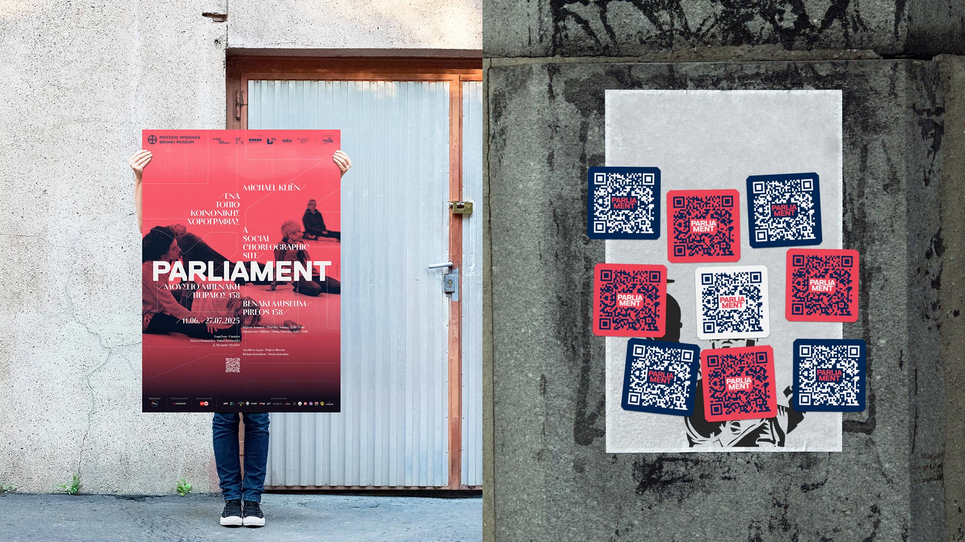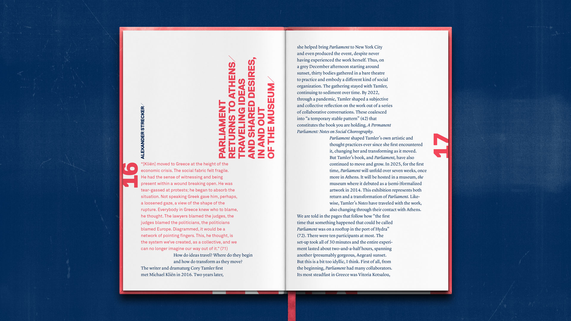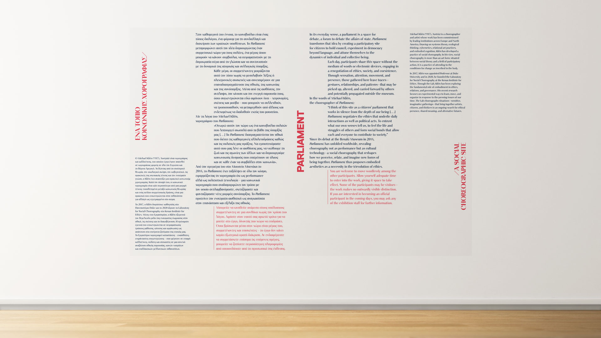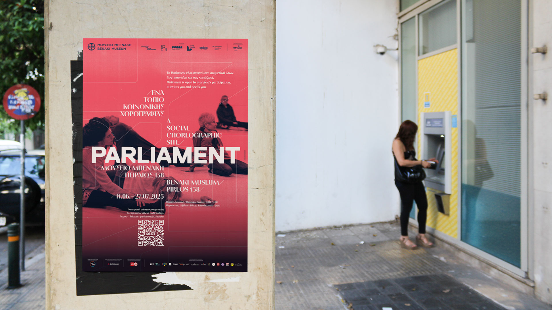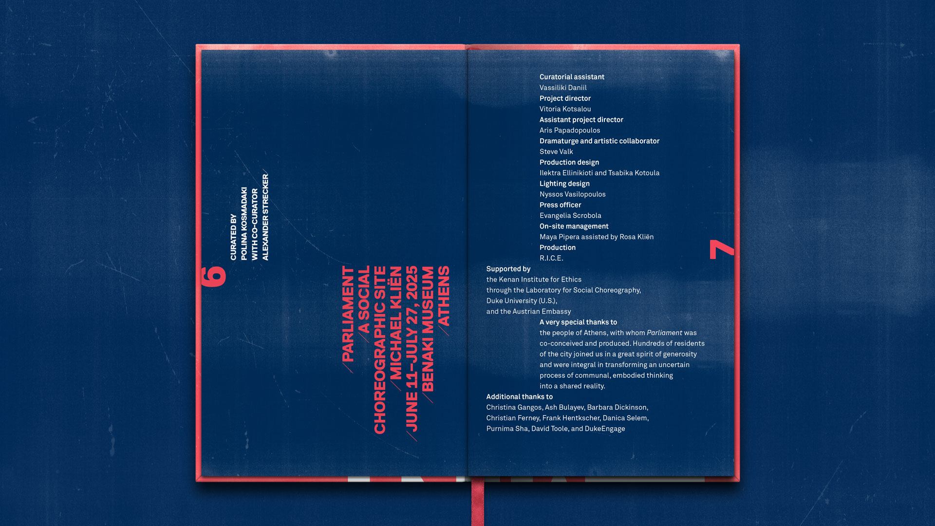 Parliament, a work by choreographer and artist Michael Kliën, is a landmark in the emerging field of Social Choreography. Conceptualized in 2011, Parliament was first exhibited at the Benaki Museum in 2014. Since then, it has evolved in design and scope through new iterations across Europe and the United States. The expanded iteration of Parliament was presented for the first time as a full-scale exhibition at the Benaki Museum in the summer of 2025, for which Rafal Kosakowski developed an identity based on the 2021 book A Permanent Parliament. This book has also been expanded to include a new introduction by exhibition curators Polina Kosmadaki and Alexander Strecker and published as a Special Benaki Museum Edition.