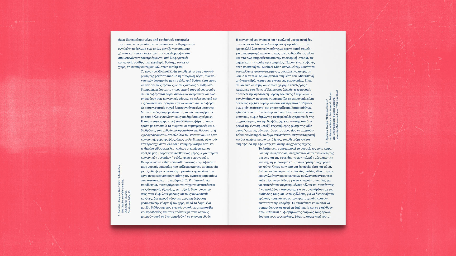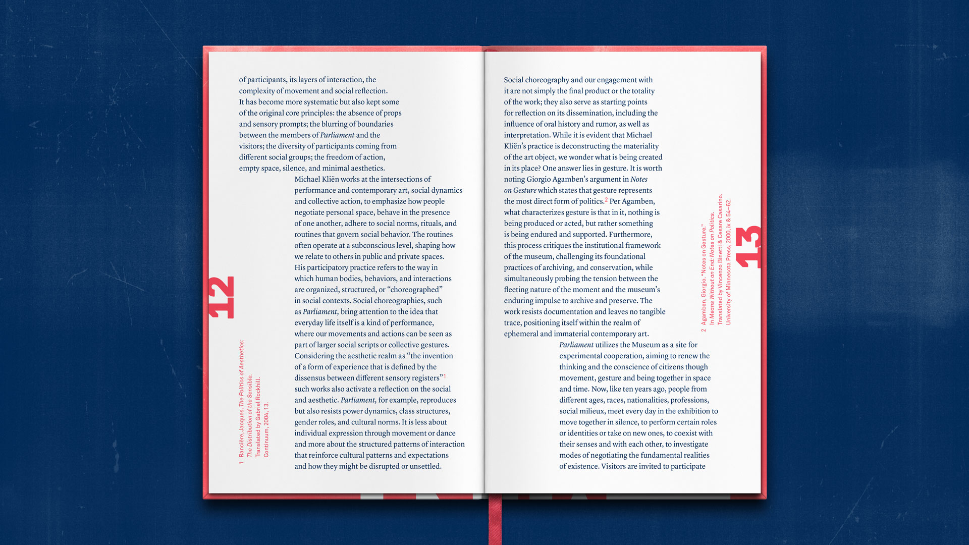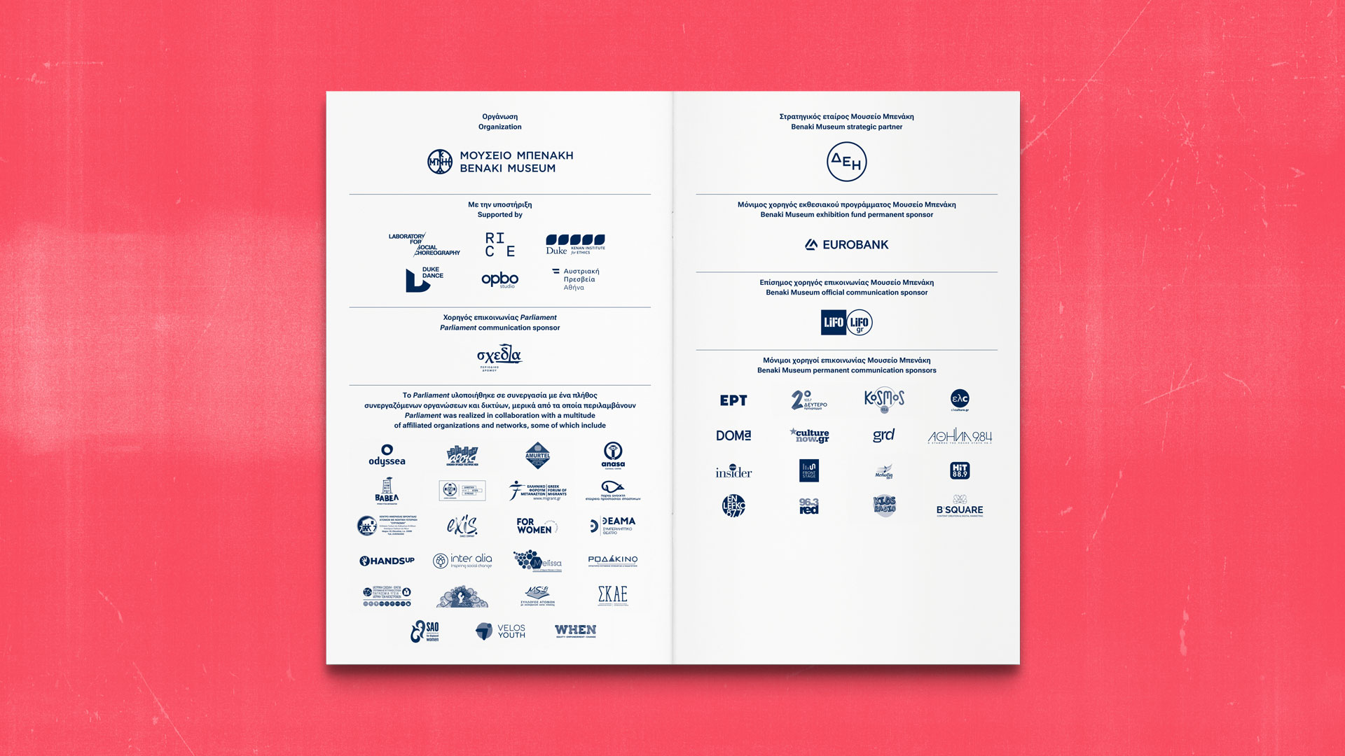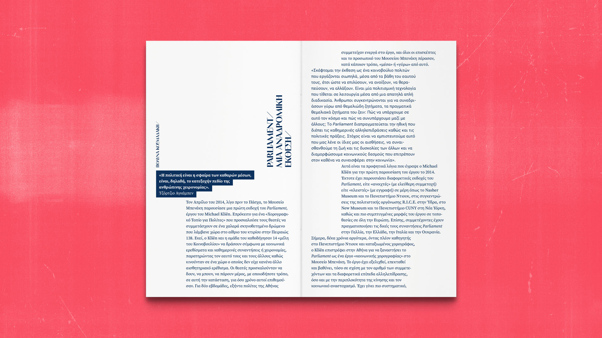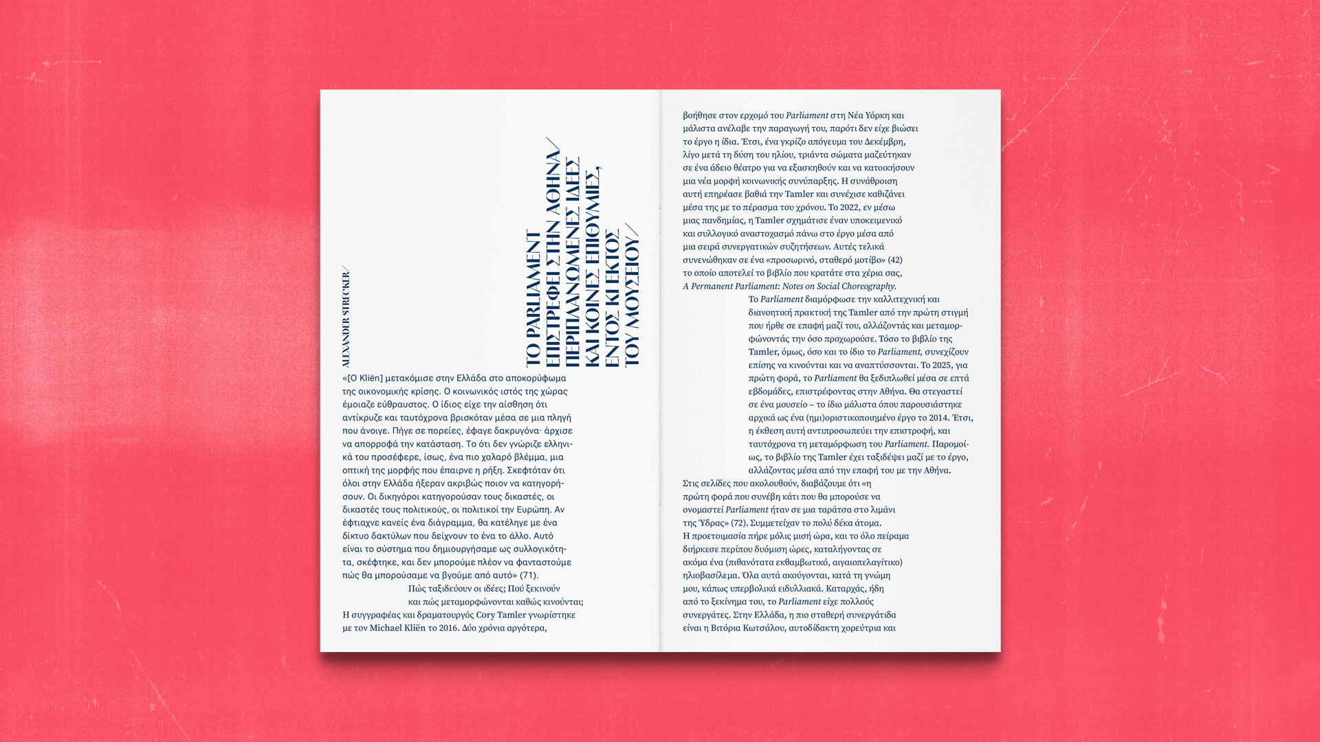 Parliament, a work by choreographer and artist Michael Kliën, is a landmark in the emerging field of Social Choreography. Conceptualized in 2011, Parliament was first exhibited at the Benaki Museum in 2014. Since then, it has evolved in design and scope through new iterations across Europe and the United States. The expanded iteration of Parliament was presented for the first time as a full-scale exhibition at the Benaki Museum in the summer of 2025, for which Rafal Kosakowski developed an identity based on the 2021 book A Permanent Parliament. This book has also been expanded to include a new introduction by exhibition curators Polina Kosmadaki and Alexander Strecker and published as a Special Benaki Museum Edition.