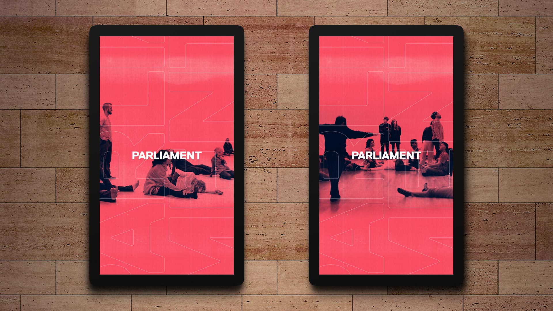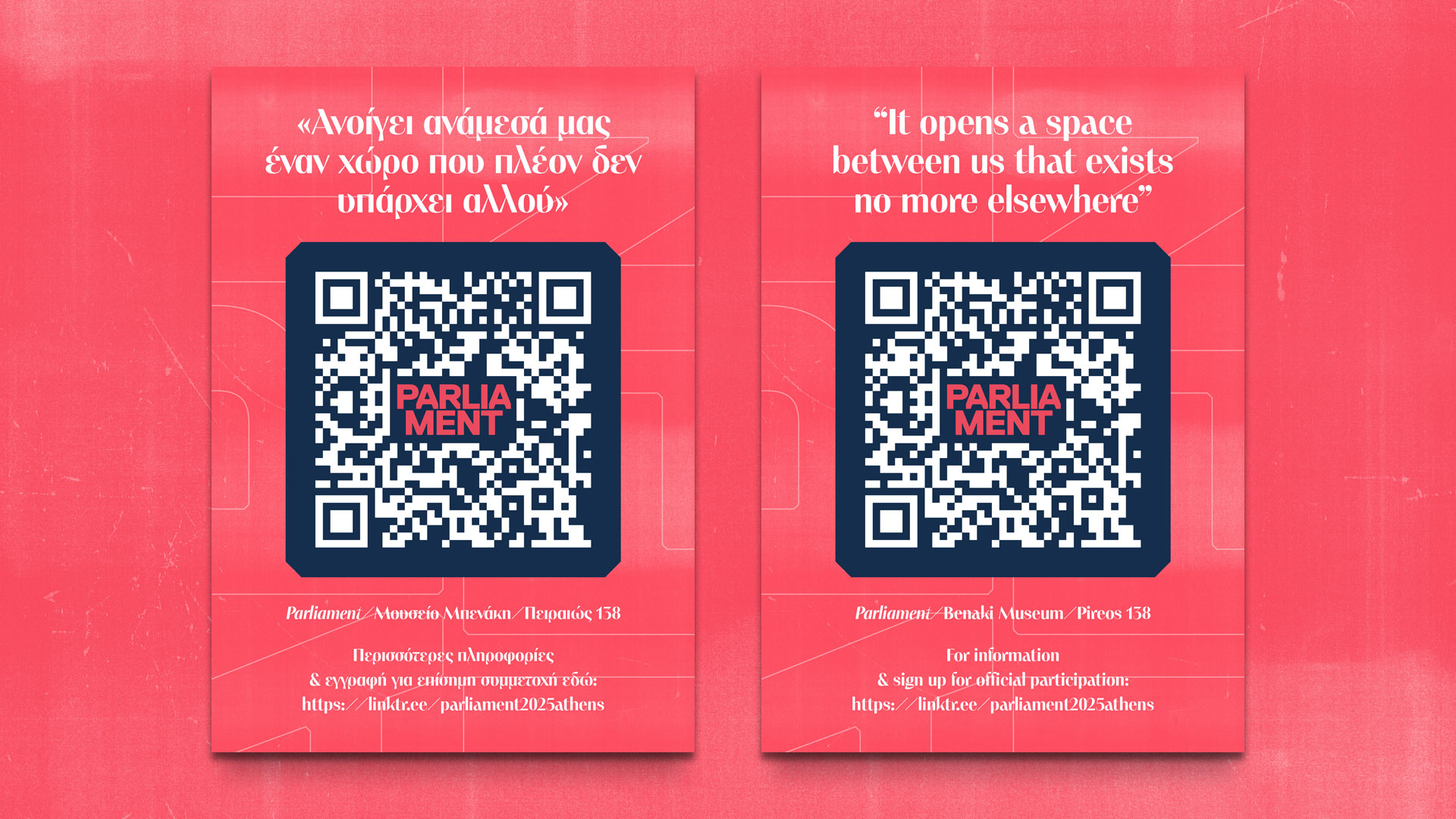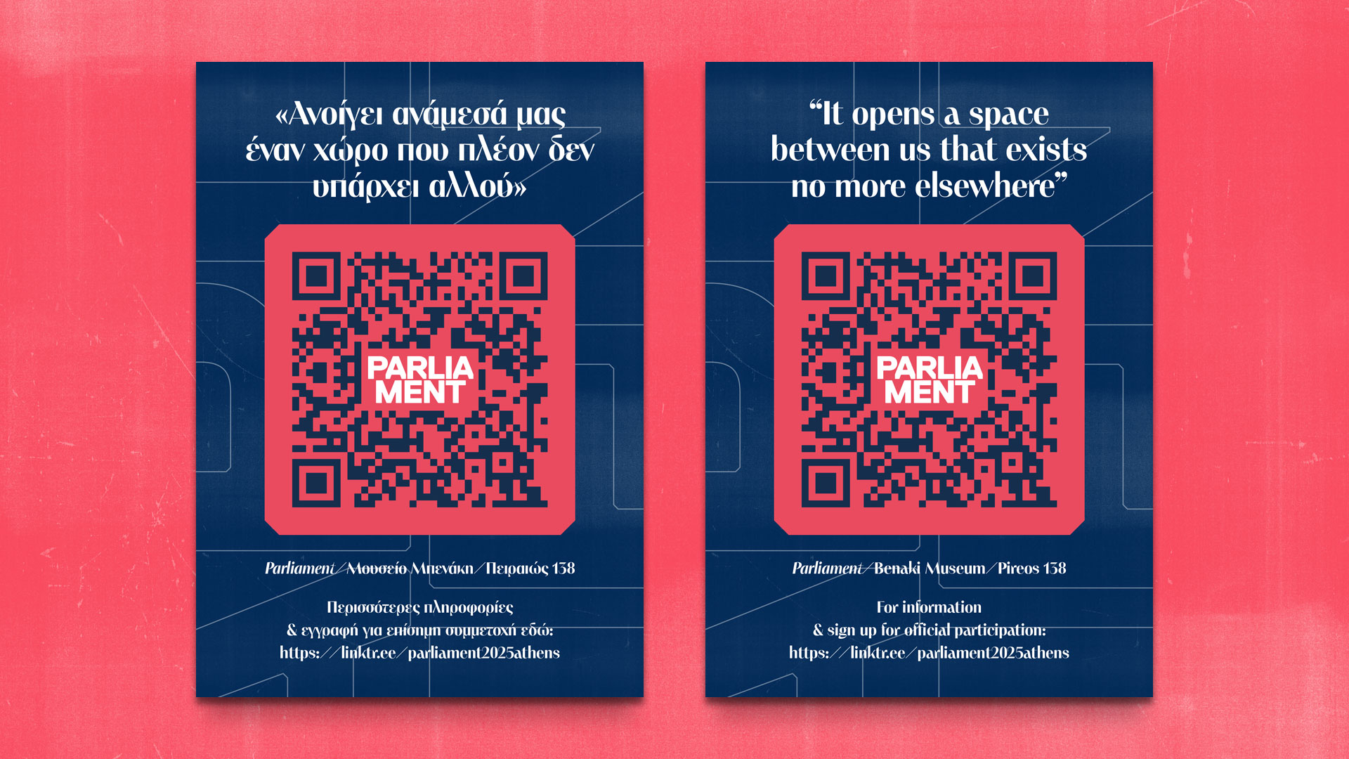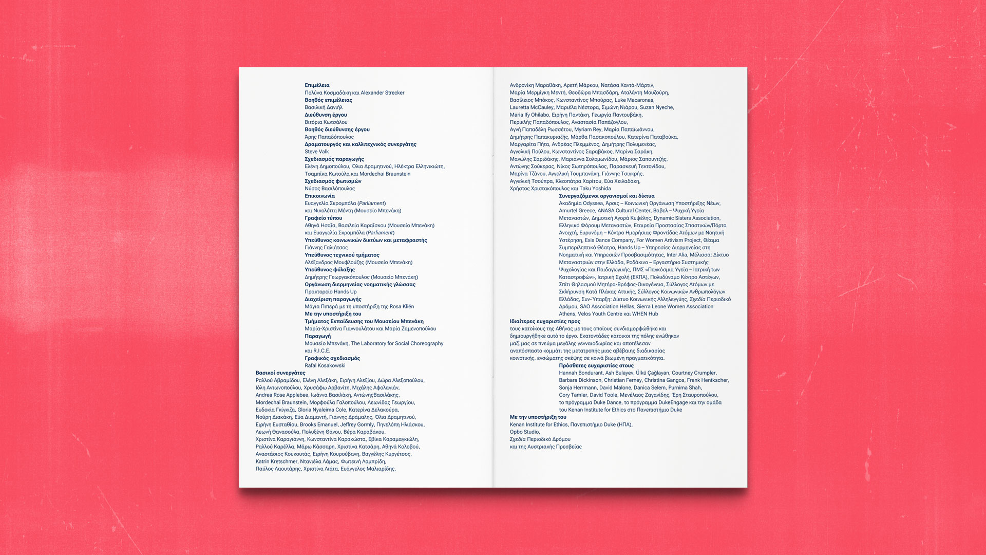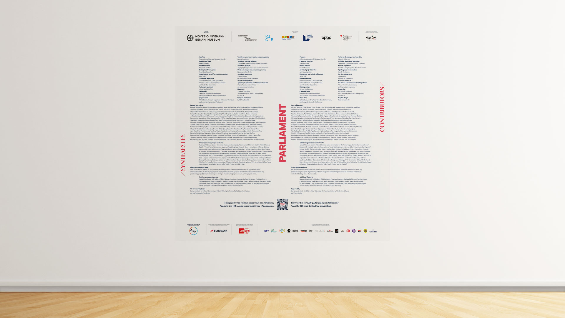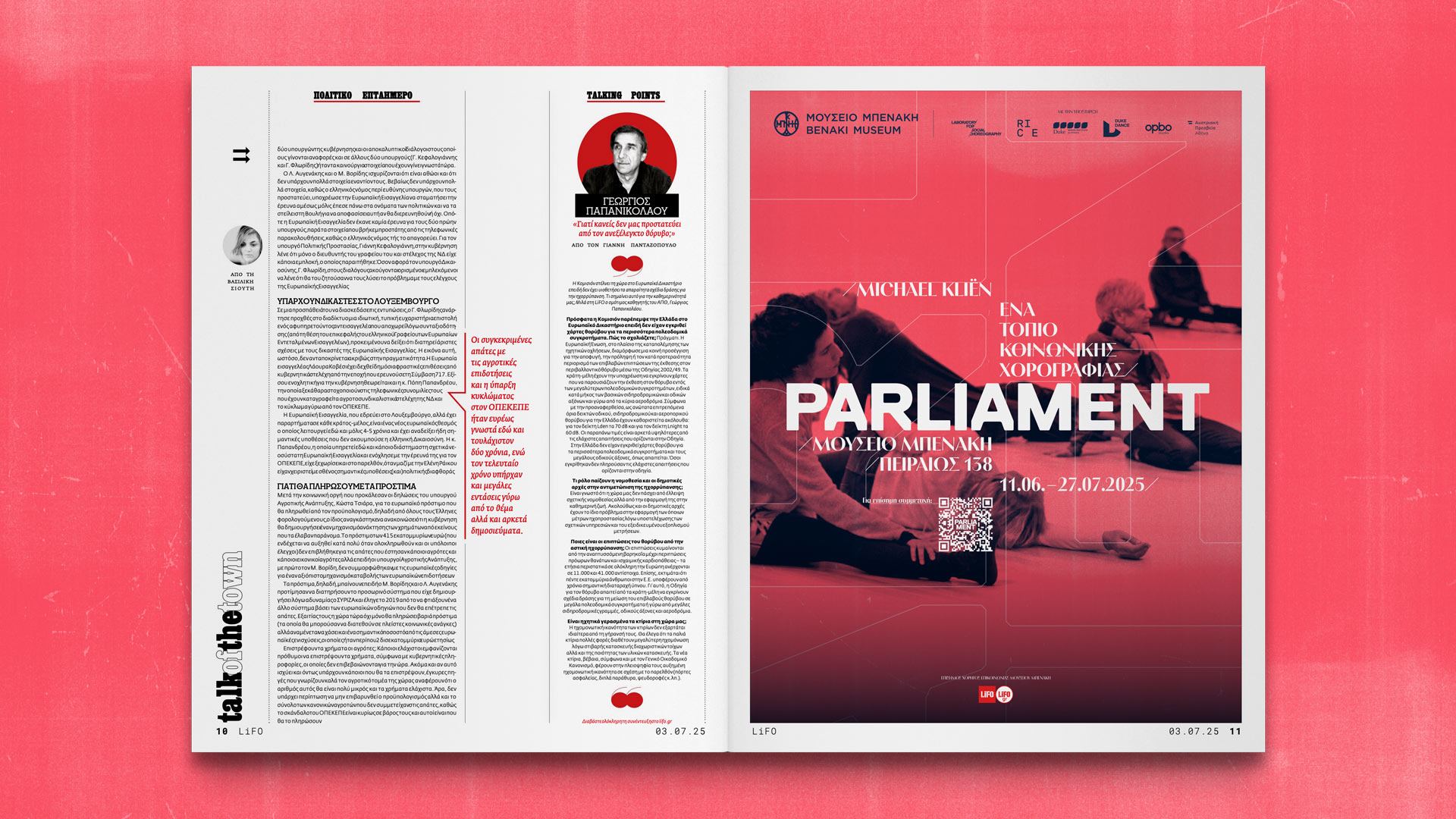 Parliament, a work by choreographer and artist Michael Kliën, is a landmark in the emerging field of Social Choreography. Conceptualized in 2011, Parliament was first exhibited at the Benaki Museum in 2014. Since then, it has evolved in design and scope through new iterations across Europe and the United States. The expanded iteration of Parliament was presented for the first time as a full-scale exhibition at the Benaki Museum in the summer of 2025, for which Rafal Kosakowski developed an identity based on the 2021 book A Permanent Parliament. This book has also been expanded to include a new introduction by exhibition curators Polina Kosmadaki and Alexander Strecker and published as a Special Benaki Museum Edition.