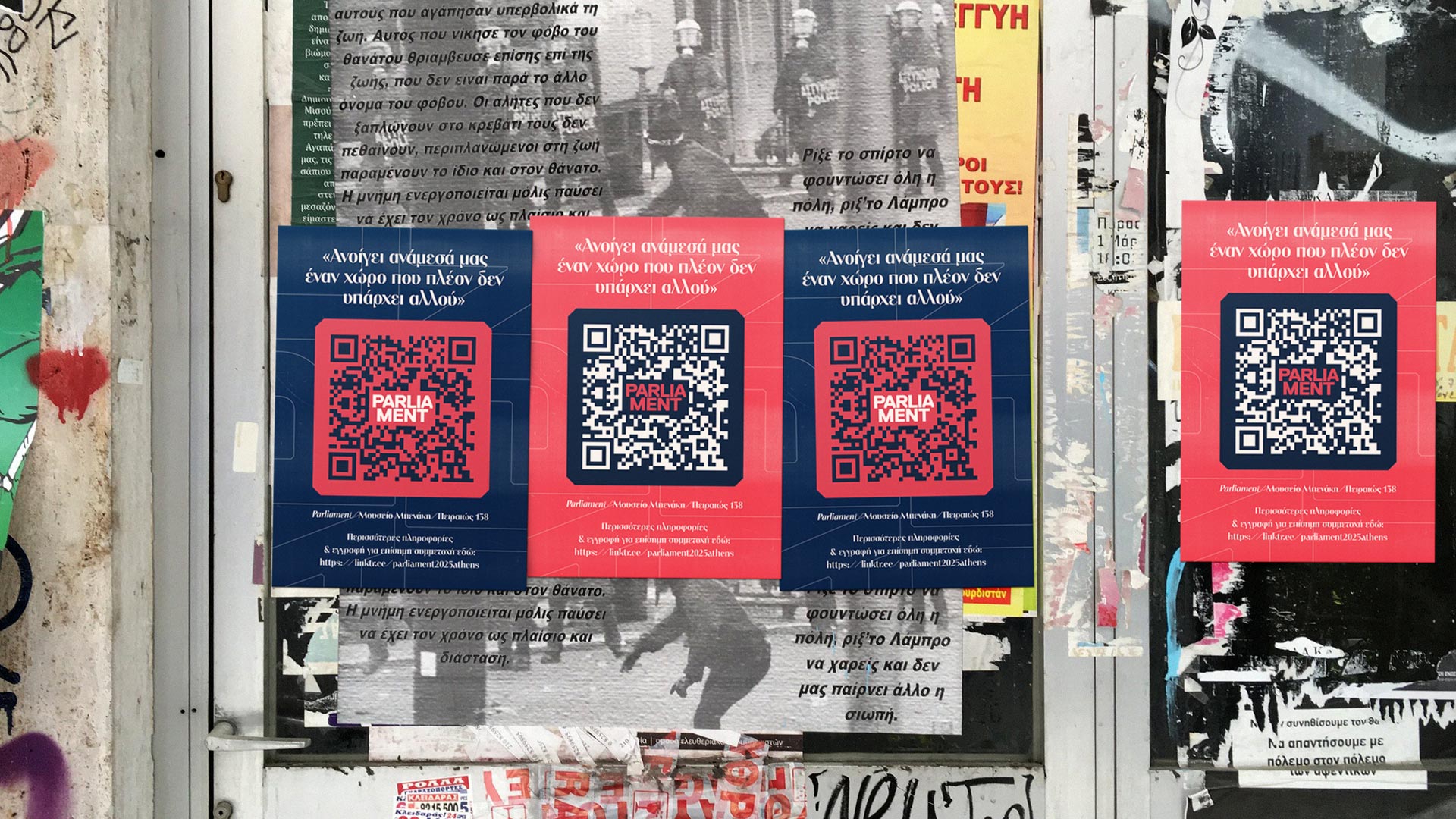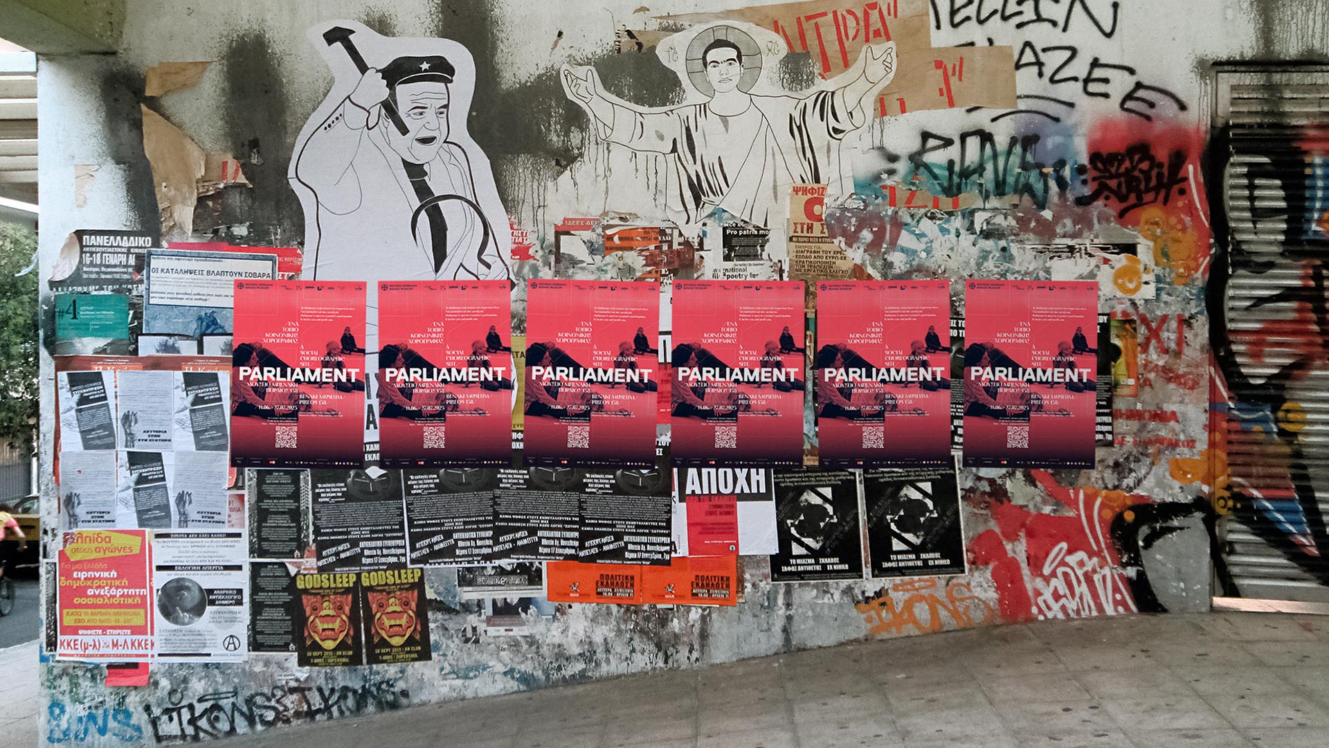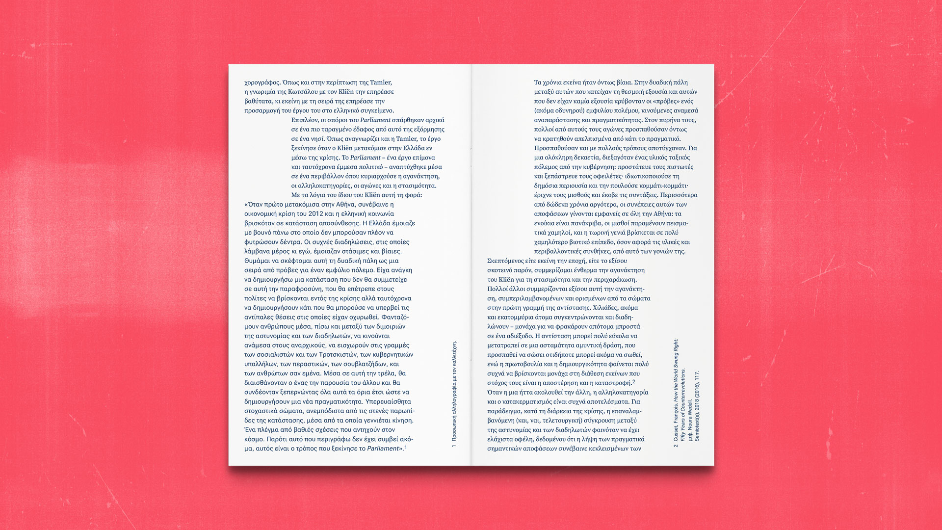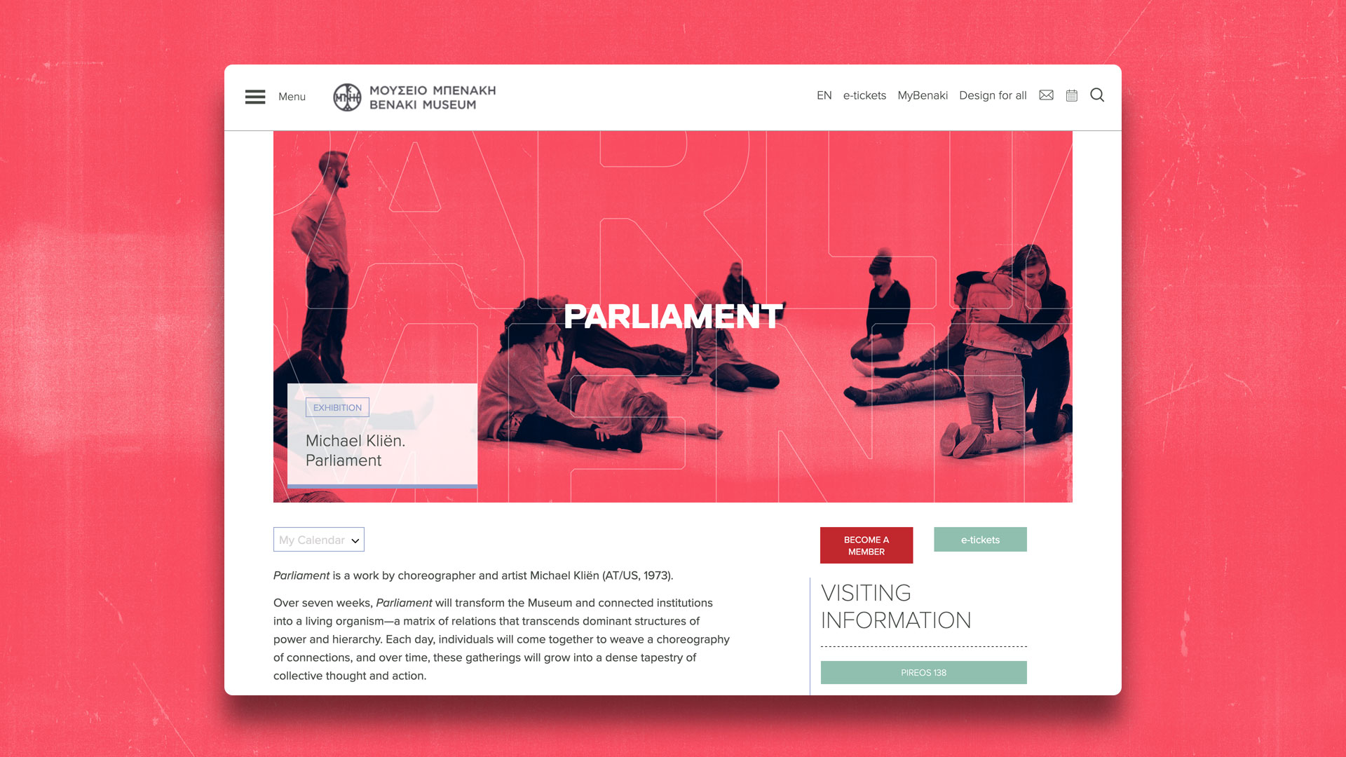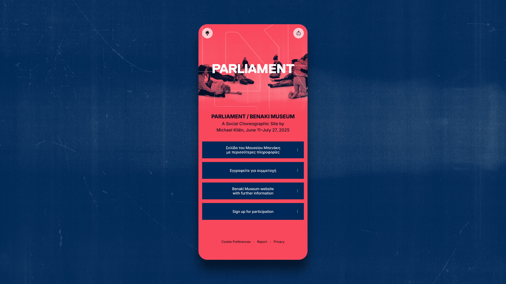 Parliament, a work by choreographer and artist Michael Kliën, is a landmark in the emerging field of Social Choreography. Conceptualized in 2011, Parliament was first exhibited at the Benaki Museum in 2014. Since then, it has evolved in design and scope through new iterations across Europe and the United States. The expanded iteration of Parliament was presented for the first time as a full-scale exhibition at the Benaki Museum in the summer of 2025, for which Rafal Kosakowski developed an identity based on the 2021 book A Permanent Parliament. This book has also been expanded to include a new introduction by exhibition curators Polina Kosmadaki and Alexander Strecker and published as a Special Benaki Museum Edition.