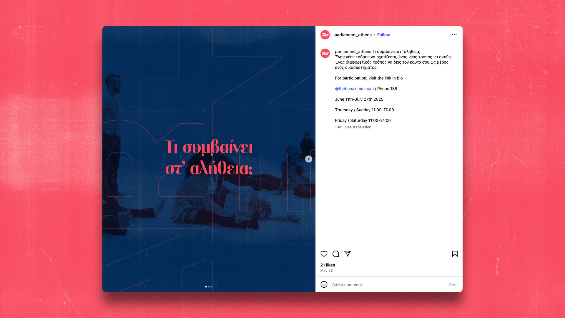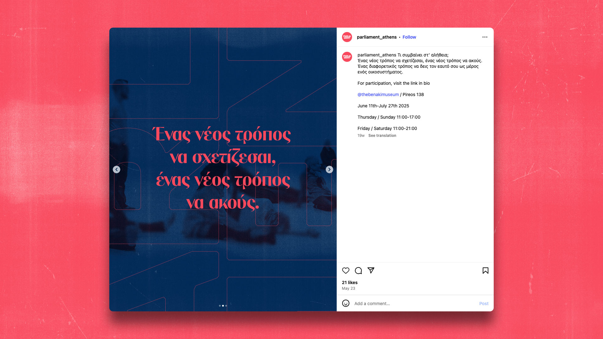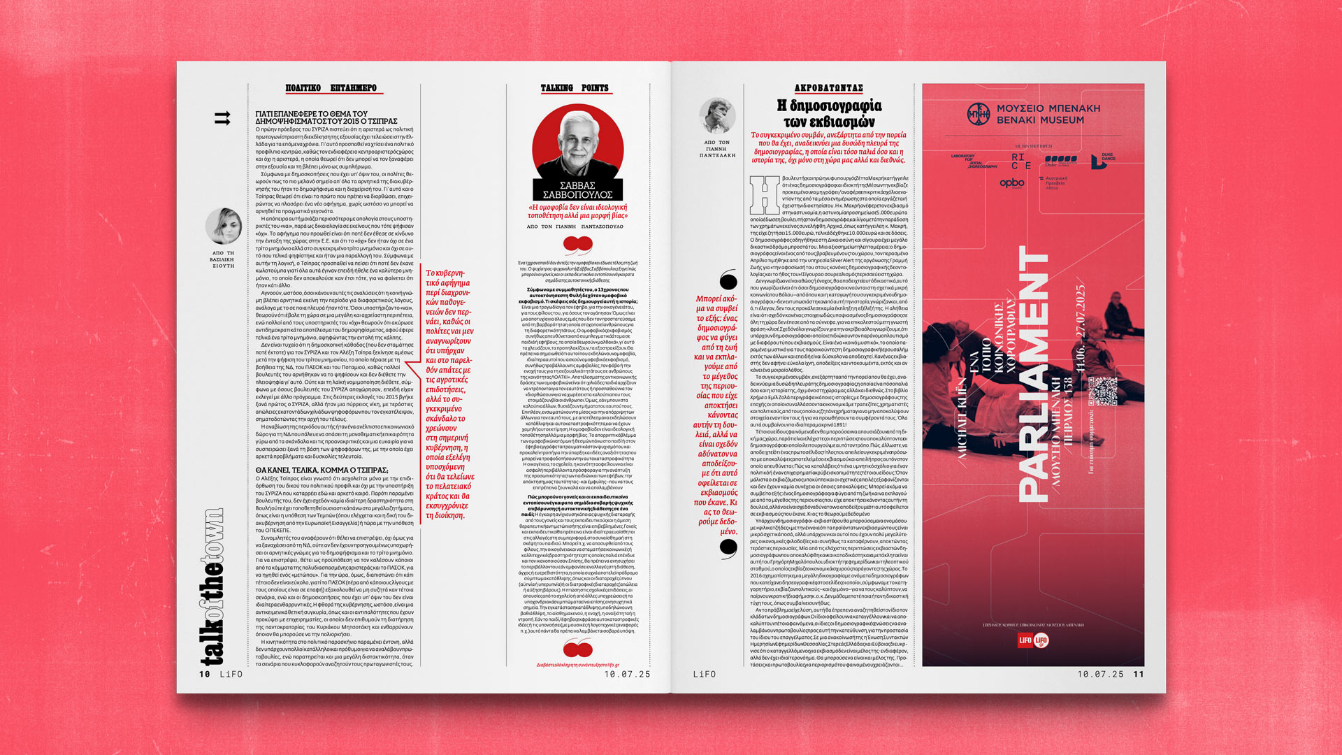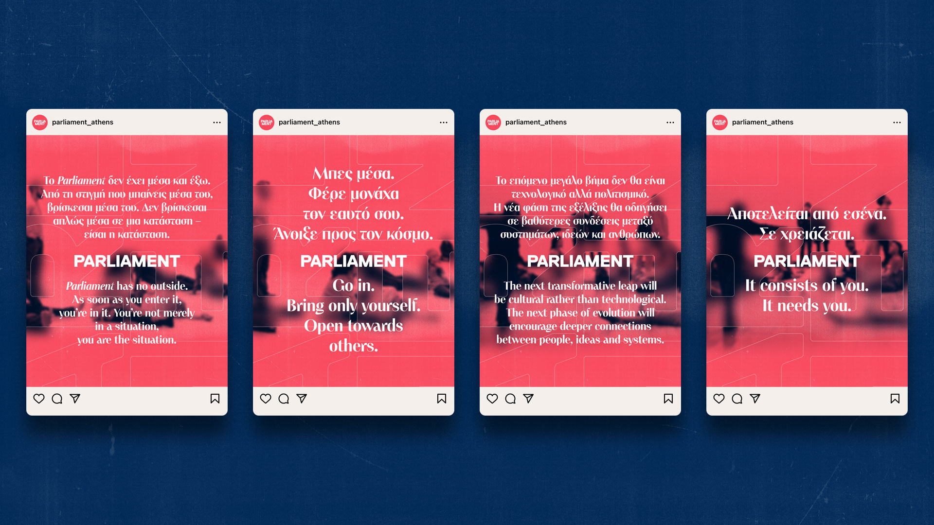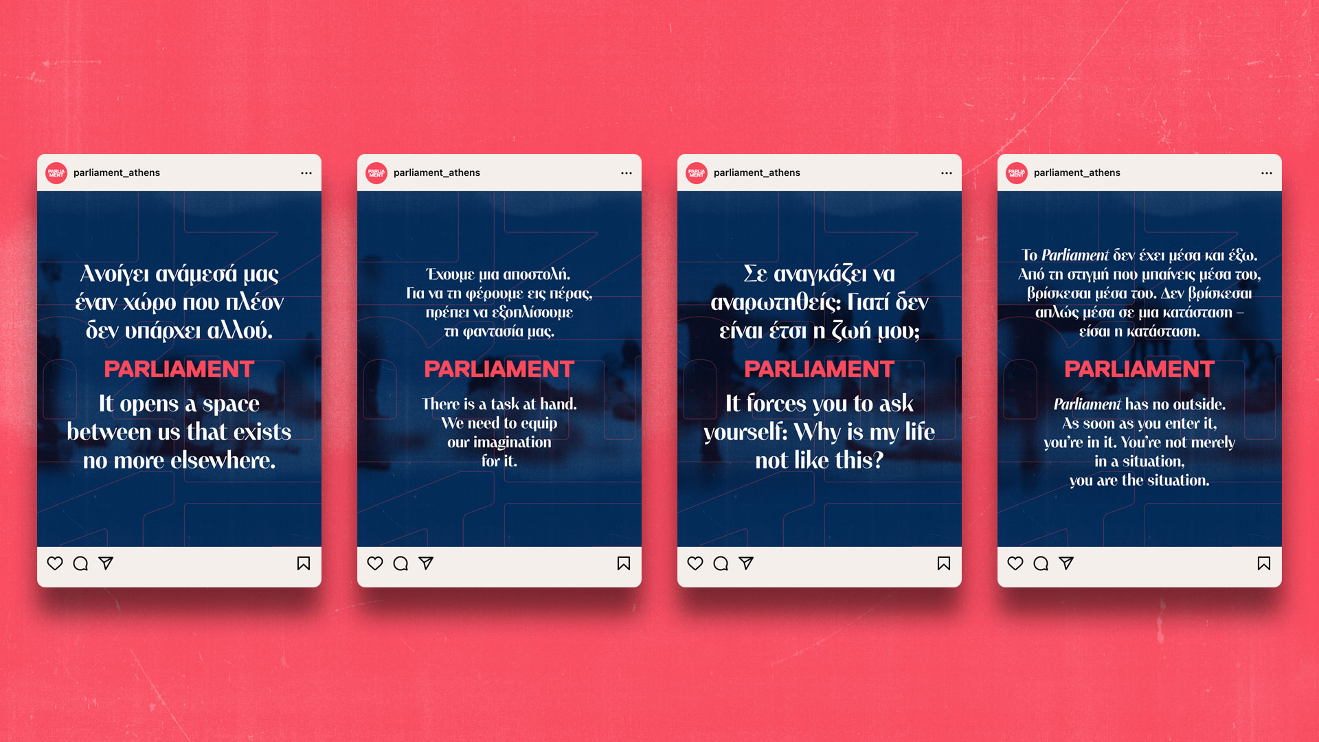 Parliament, a work by choreographer and artist Michael Kliën, is a landmark in the emerging field of Social Choreography. Conceptualized in 2011, Parliament was first exhibited at the Benaki Museum in 2014. Since then, it has evolved in design and scope through new iterations across Europe and the United States. The expanded iteration of Parliament was presented for the first time as a full-scale exhibition at the Benaki Museum in the summer of 2025, for which Rafal Kosakowski developed an identity based on the 2021 book A Permanent Parliament. This book has also been expanded to include a new introduction by exhibition curators Polina Kosmadaki and Alexander Strecker and published as a Special Benaki Museum Edition.